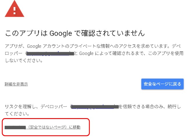 「このアプリはGoogleで確認されていません」という警告メッセージが出るため、少しびっくりされるかもしれませんが、ご安心ください。 これはGoogle Apps Scriptで開発されたプログラムを動かす際、一般的に表示される確認画面です。悪意をもって開発されたプログラムは重大な障害を引き起こすものがあるのは事実ですが、当社が開発したプログラムには危険なものはありませんので、手順通り進めて下さい。