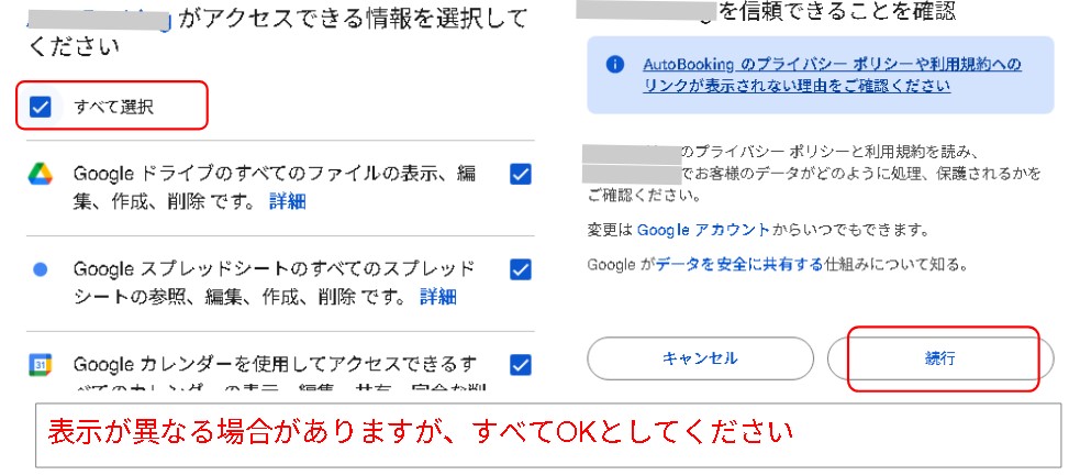 「アクセスできる情報を選択してください」という項目がありますので、「すべて選択」にチェックを入れてください。