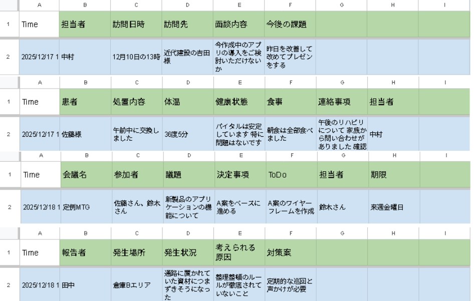 LINEに送られたメッセージをAIが分析し、各項目に記録すべき内容を抽出します。訂正すべき事項があれば、直接シート上で編集することもできます。